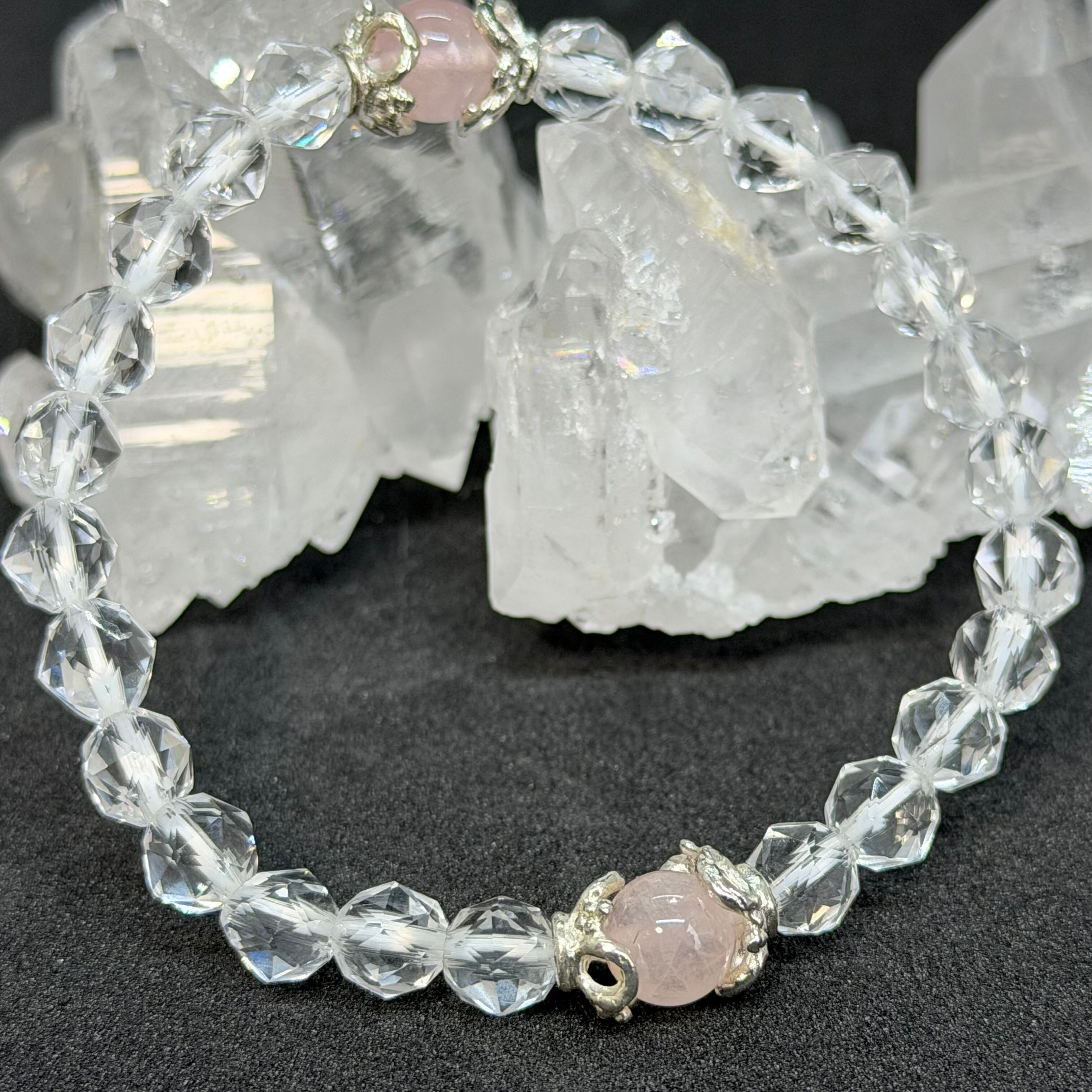 自己肯定感や自身への評価を高め大事にするローズクォーツと調和や浄化に優れカッティングにより負の感情を撥ねる水晶の組み合わせです。